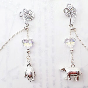 | 極地的愛 | 北極熊與企鵝・施華洛世奇愛心 環保意識耳環 純銀耳鏈 可調式無痛專利耳夾