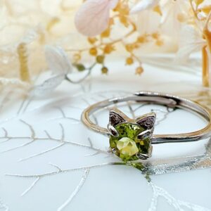 | 貓咪 橄欖石 | 8月誕生石 | 鑲小鑽 可調式純銀戒指 禮盒